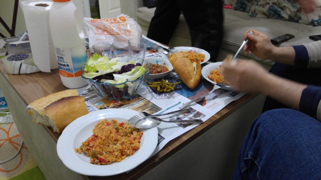 Wir quetschten uns also in einen nach türkischen Vorstellungen mit allerhand Schnick-Schnack geschmückten Bus, es können eigentlich unbegrenzt viele Menschen mitfahren, nur die Tür muss sich jedes Mal schließen lassen („geschlossen“ ist dann übrigens der Definition des Fahrers überlassen). Wir jagten durch die überfüllten Straßen des Feierabendverkehrs, der Fahrer quetschte sich in immer neue Lücken hinein, die Hupe wurde als Alternative zur Bremse genutzt. Wir kamen dann irgendwann an, Recep kochte noch für uns.