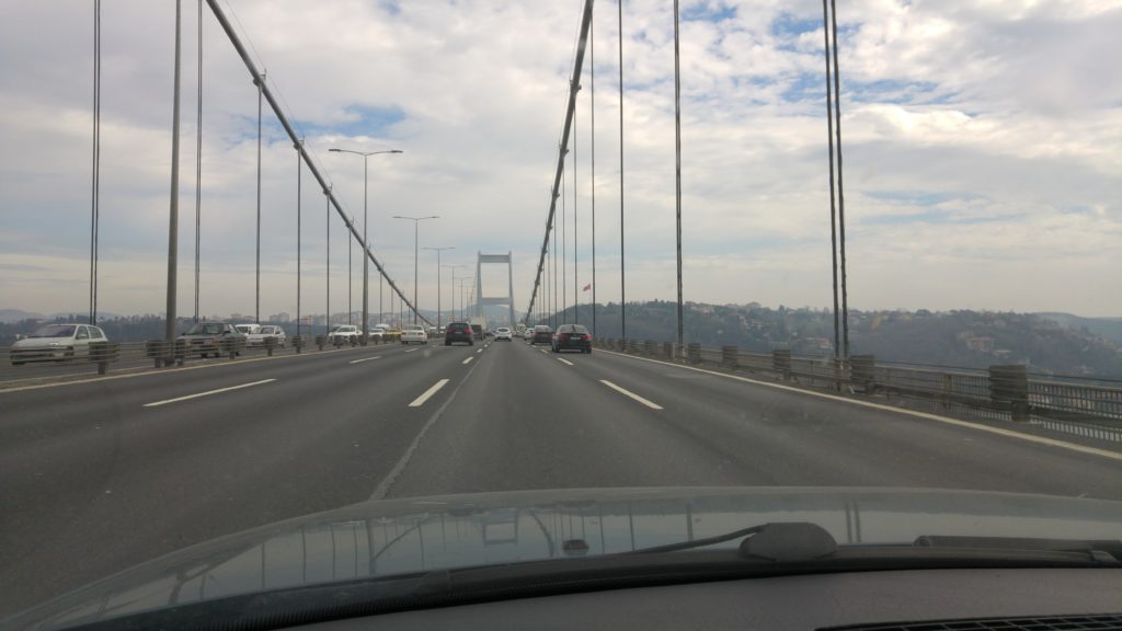 Nach der Verabschiedung von meinem Host in Istanbul machte ich mich wieder in den Istanbuler Verkehr auf und — wie sollte es auch anders kommen — verfuhr mich auf dem Weg zur Fatih-Sultan-Mehmet-Brücke, die die beiden Teile Istanbuls verbindet. Dank Navi konnte ich aber schließlich in den asiatischen Teil einfahren. Der Blick von der Brücke war recht schön, aber wegen leichten Nebels sah man nicht allzu viel.
