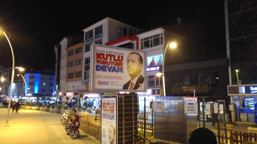 Da der gute Recep Tayyip Erdogan die Stadt am Mittag besucht hatte, hingen Plakate und Banner, Parteiwimpel flatterten langsam im Wind — es hatte durchaus einen gewissen „diktatorischen“ Anreiz. Erdogan lächelte weichgezeichnet von übergroßen Bildern, sein Name war in riesigen Buchstaben überall in der Stadt verteilt. Am Abend machte ein Autokorso nach dem Motto „I love Erdogan egal was er tut“ die Stadt unsicher.
