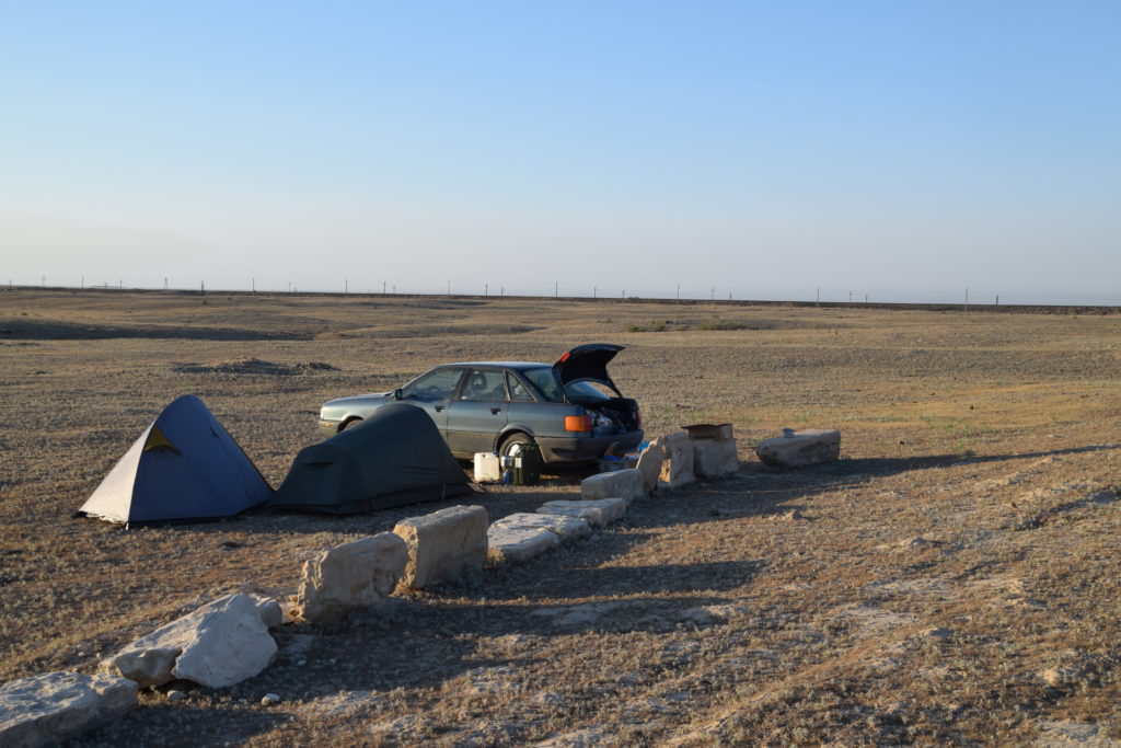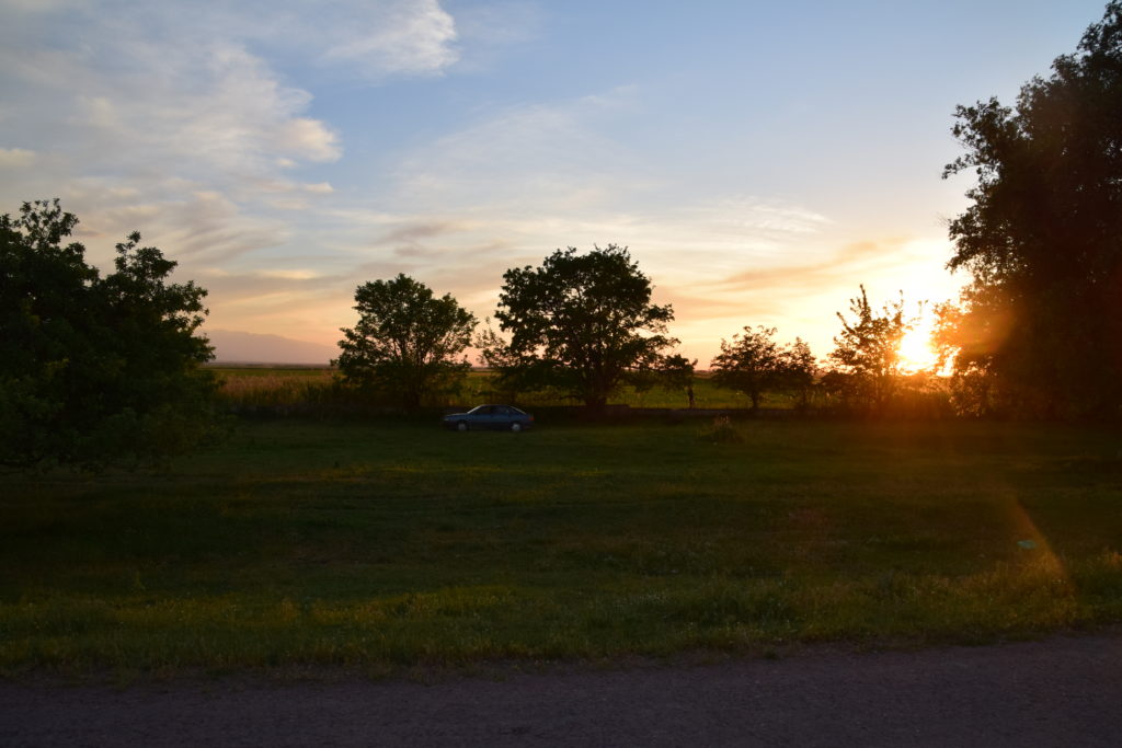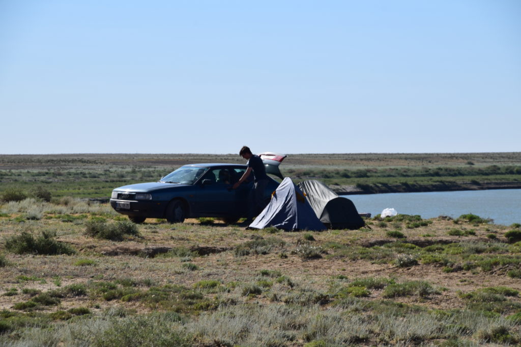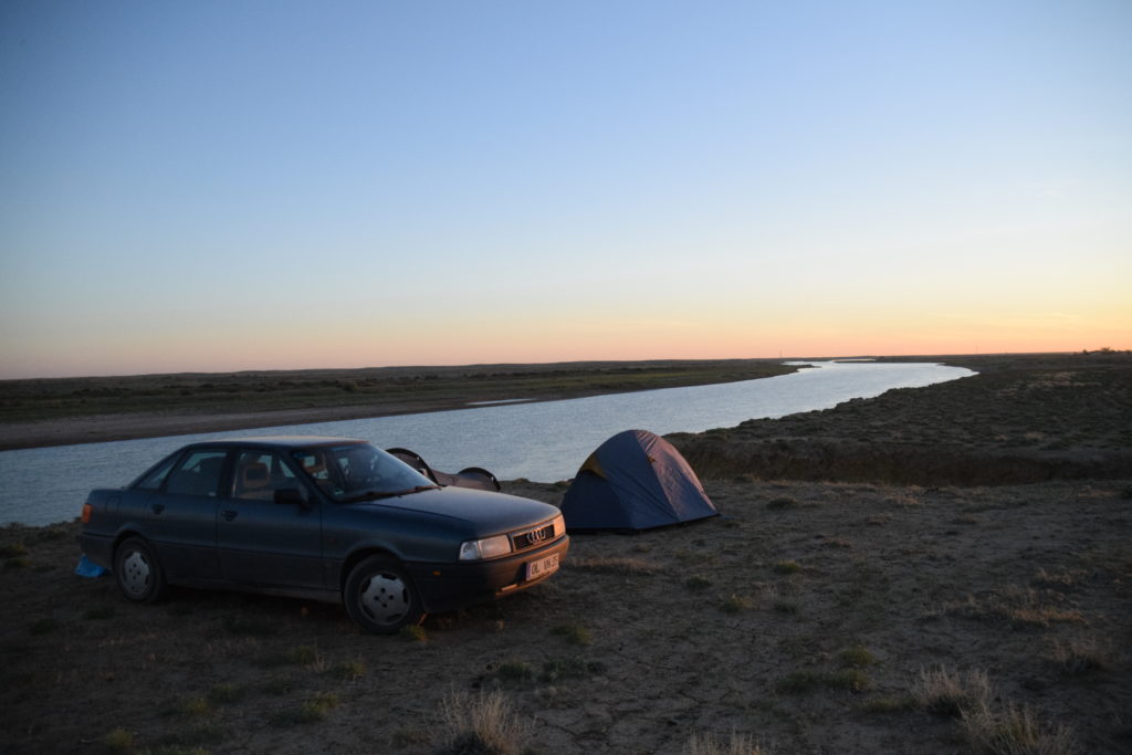 Gegen Abend, als die Dämmerung langsam über die kasachischen Ebenen hereinbrach, schauten wir uns langsam nach einem Platz für die Nacht um. Eher nach dem Zufallsprinzip bog ich von der Hauptstraße ab, die uns bis zur russischen Grenze führen würde, und fuhr ein wenig in die Landschaft. Nach ein paar Minuten entdeckten wir einen versteckten Platz zwischen ein paar Bäumen, der für eine Nacht mehr als ausreichen sollte.