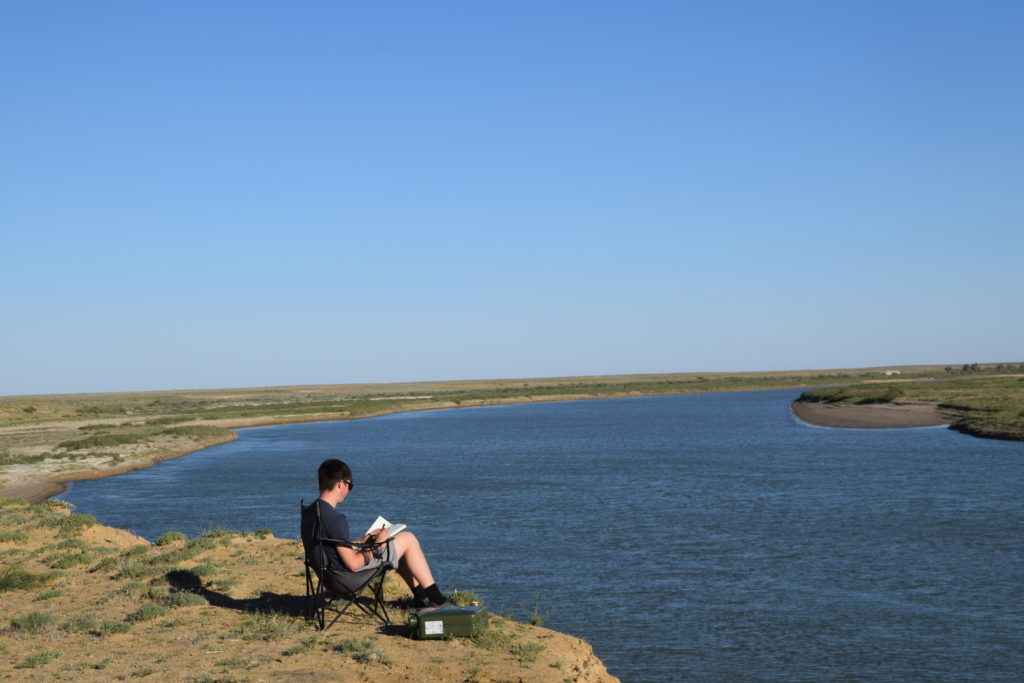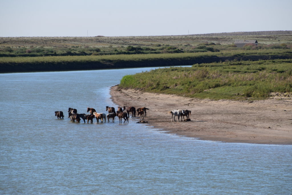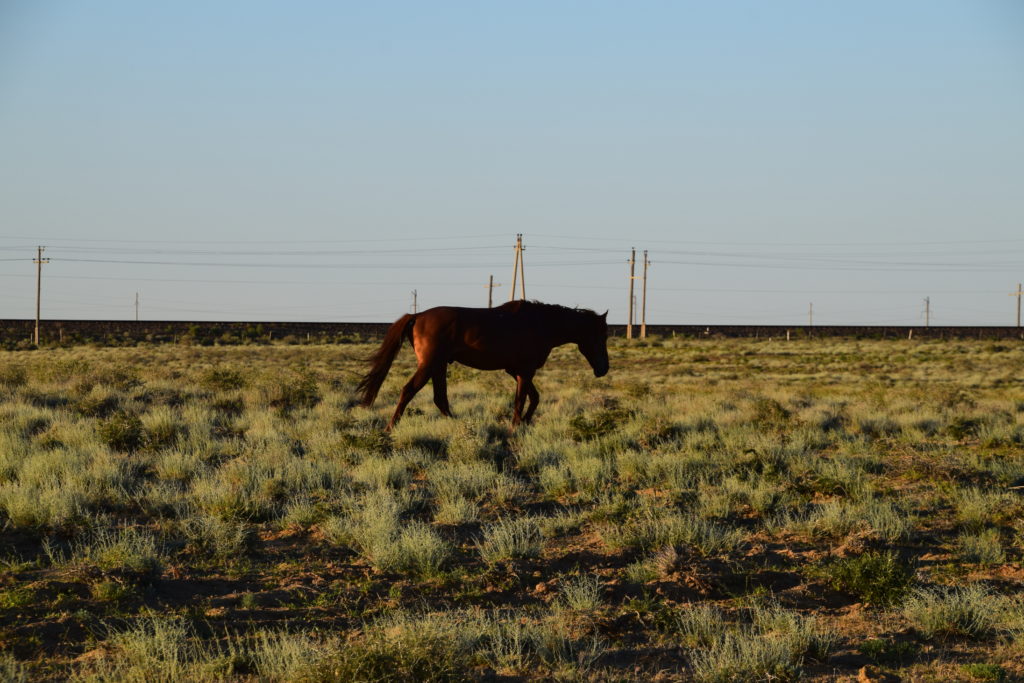 Mitten in der Nacht wurde ich von Wassergeräuschen geweckt. Panisch weckte ich Lukas, campten wir doch direkt an der Klippe zum Wasser und ich hatte die Befürchtung, dass irgendein kasachisches Flussungetüm es auf uns abgesehen habe. Ich griff nach einer Lampe, leuchtete Richtung Fluss und sah — Wildpferde.
