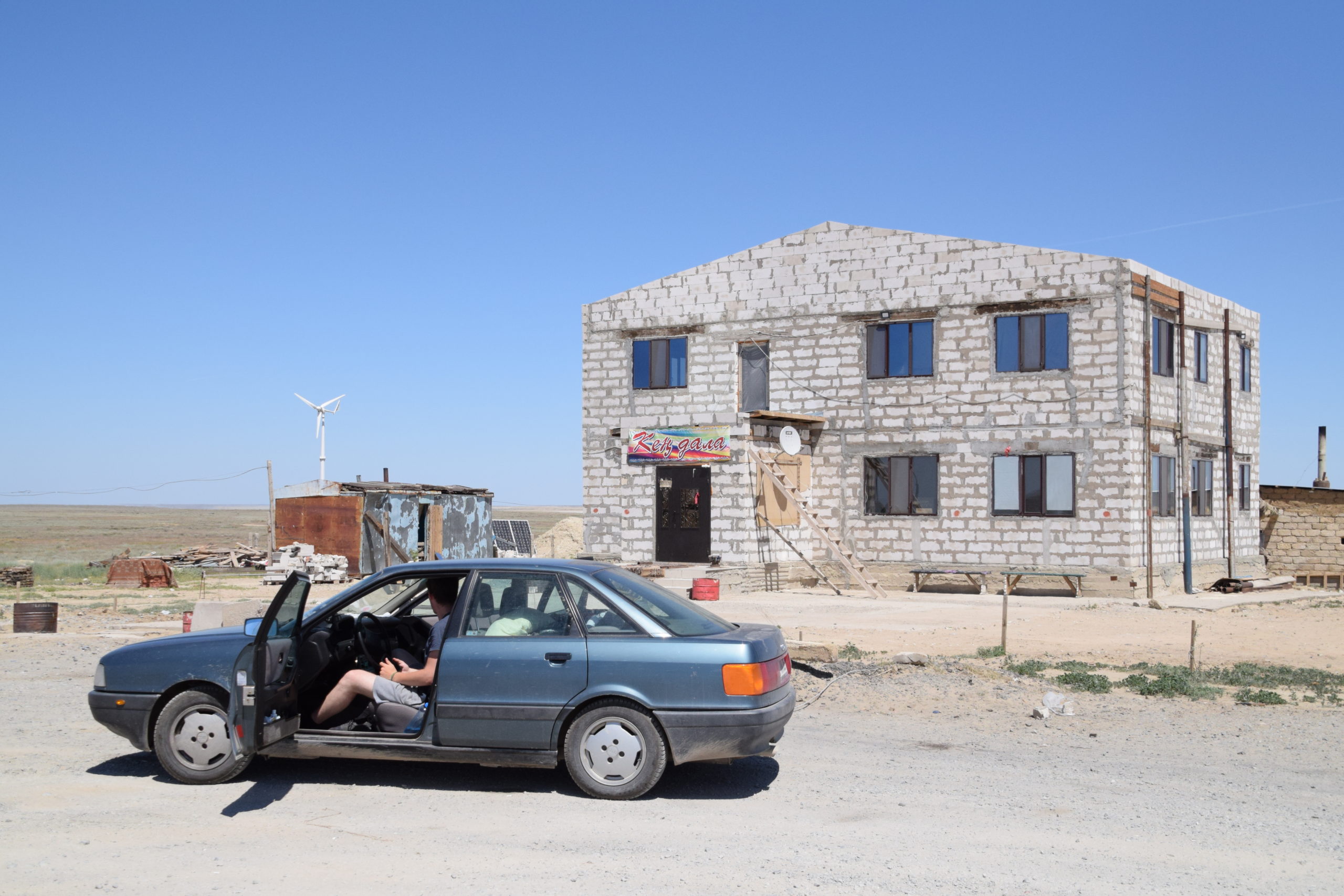 Nach dem Frühstück wurden wir schon bald erneut von der Polizei gestoppt, diesmal aber zugebenerweise nicht zu Unrecht. Eigentlich darf man auf kasachischen Autobahnen 100 km/h fahren, was ich auf der überraschend gut ausgebauten Straße auch tat — bis einfach so, ohne erkennbaren Grund, ein „50“-Schild auftauchte. Ich hatte echt keine Lust zu bremsen und ließ den Audi einfach ausrollen. Hätte ich vorher mal den Rückspiegel gecheckt, was ich wegen des dünnen Verkehrs länger nicht getan hatte, wäre mir aufgefallen, dass uns schon länger ein Polizeiwagen folgte.